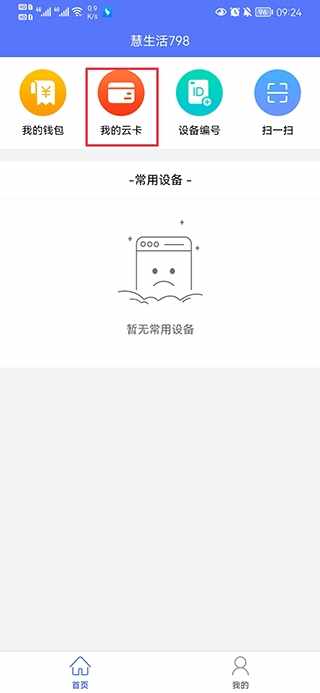 1、打开慧生活798app,在首页中点击我的(de)云卡
