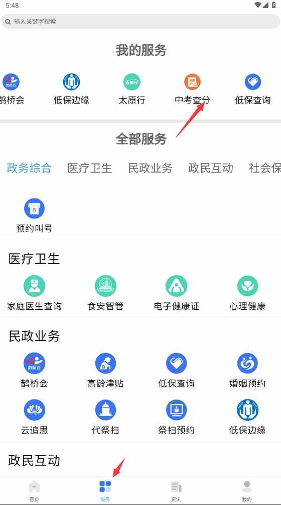 1、下载最新版本的我的太原app,打开點擊服(fu)务(wu)板块的中考查分