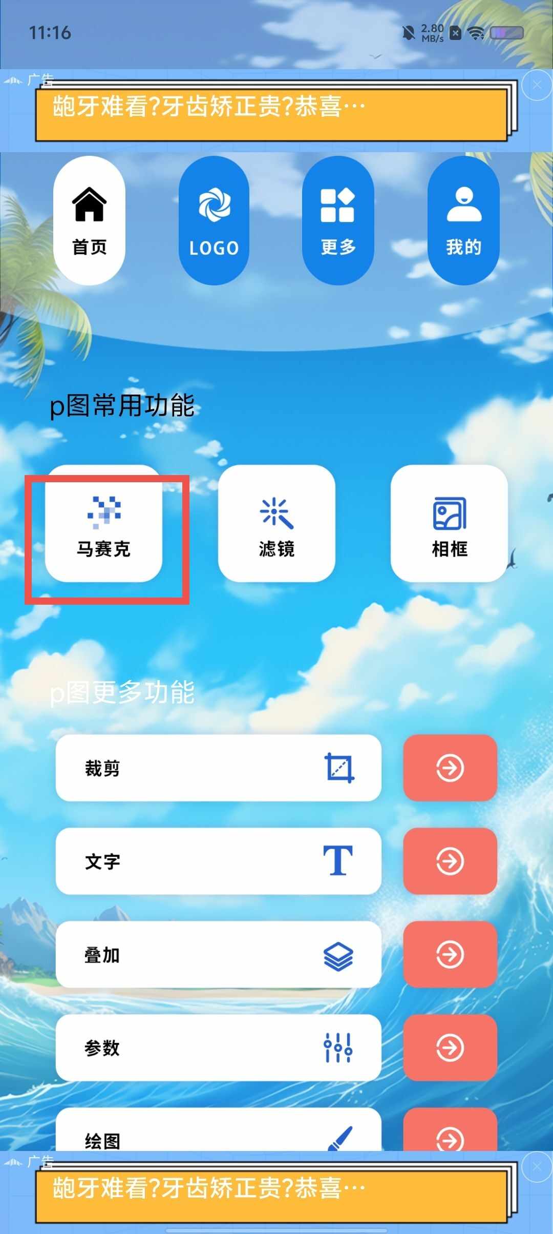 1、第一步,点击功能栏中的“马赛克”