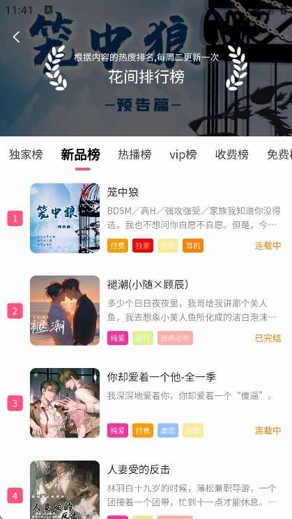 3、排行榜与分类推荐:设有“广播剧排行榜”(含独家榜、新品榜等)、分类筛选(按题材、热度、是否凂曊等),方便用户快速找到热门或心仪的内容。