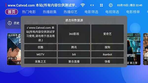 1、软件自带影视源接口配置,无需导入,点击左上角的影视源接口可以进行切(qie)换。
