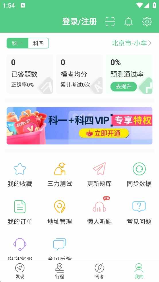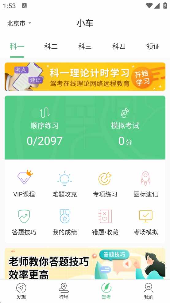 3、题库更新完成后,进入“发(fa)现”页,可使用计时课程(cheng)、VIP课程(cheng)等驾考学习功能。