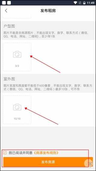 5、点击照相机标志苦熬苏上传室内图、户型图、实勘图,上传完成后勾选房源发布规则(ze)点击发布房源就可以了。