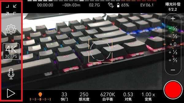 2、他们分别是缩放屏幕、设置、4k30fps、录音和播放。