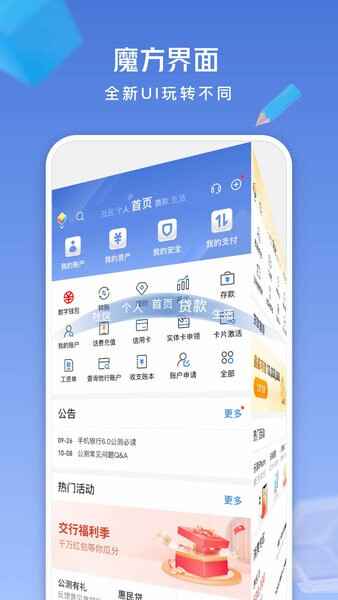 交通银行新一代手机银行8.0焕新发布!基于千面魔方的理念,打造智能便捷、安全贴心的掌上银行,全面满足新时代用户的多元化、个性化需求。