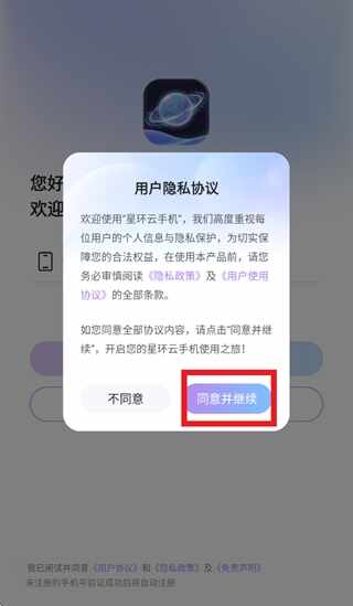 1、打开星环云手机app,在用户隐私协议提示界面点击同意并继续
