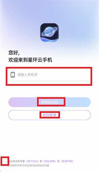 2、进入登录界面后,输入手机号,勾选我已阅读并同意意《用户协议》和《隐私政策》及《免责声明》,未注册的手机号验证成功(gong)后将自动注册,点击获取验证码登录即可(jike),还可以点击密码登录,使用手机号,密码进行登录使用