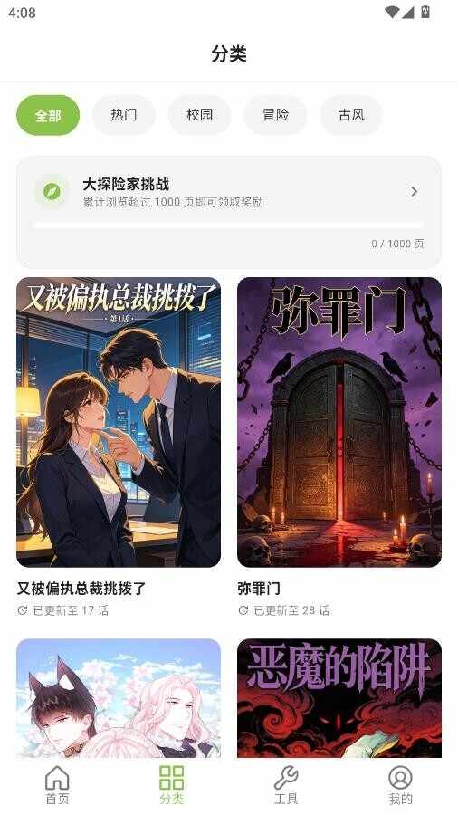 2、分类筛选浏览:通过分类板块按题材(ticai)、热度、更新(renew)时间等维度筛选漫画,快速定位目标作品。