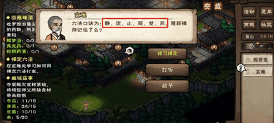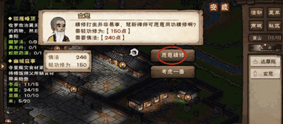 轻功修为150,向达摩院(10,10)首座玄悲学习九图六坐像。他会给你去找堂首座玄难学习坐禅。