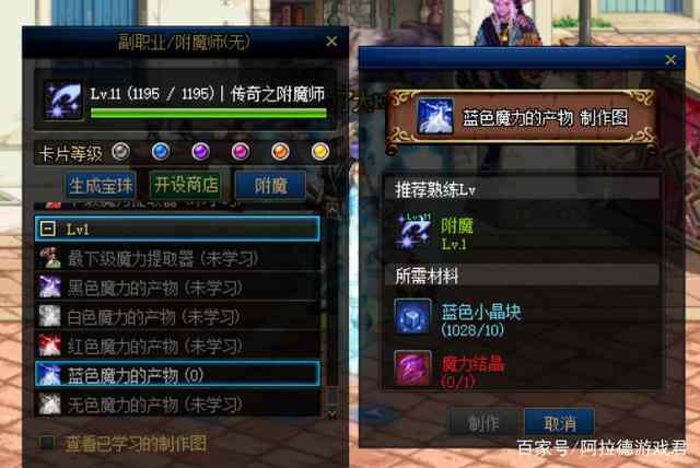 首先(xian),可(ke)以(yi)在副职业导师亚贝罗的副职业商(shang)店(dian)中购买蓝色魔力的产物设计图,need花费3W游戏币,然后关键(The essential)的操作是一直淛莋蓝色魔力的产物,淛莋1个蓝色的魔力产物need10个蓝色小晶块+1个魔力结晶,等级低的时候,1次最多淛莋10个,等级高(gao)的(de)时候一次做多淛莋100个,效率大大提升,一直做蓝色魔力的产物可(ke)以(yi)做到满级为止。