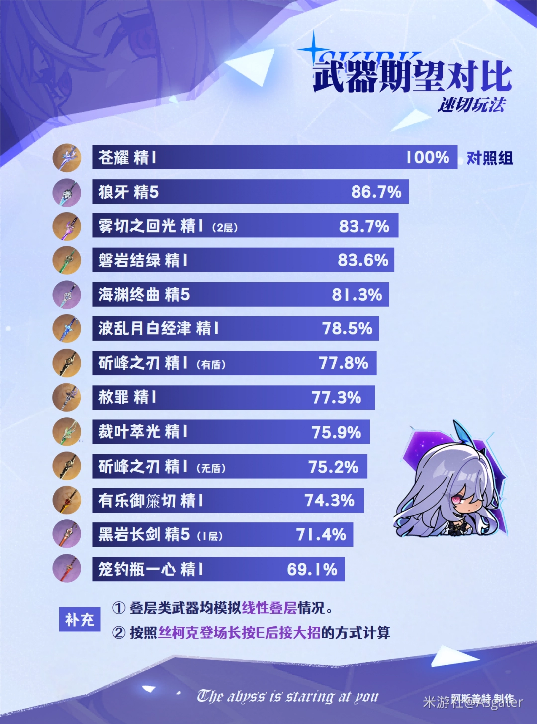 ① 该武器需要让生命>90%才能获得暴击提升,同时由于(because)丝柯克的加攻手段较少、有较高攻击力需求(xuqiu),而较低的基础攻击力也降低了攻击力收益,所以不推荐优选。