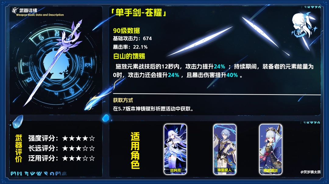 将推荐给到神里家兄妹,单纯是因为这把武器于他俩可堪一用,给到其他(qita)需要双暴的单手剑角色(role)也是同理。