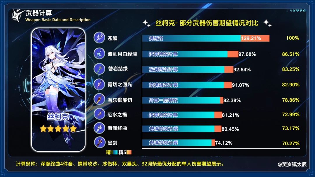 实际上,太辰也计算了裁叶萃光、赦罪和斫峰之刃的武器期望,其中,相比精炼1阶的苍耀,赦罪的武器期望是79.21%;裁叶萃光的期望是77.19%;斫峰之刃的期望是76.65%。