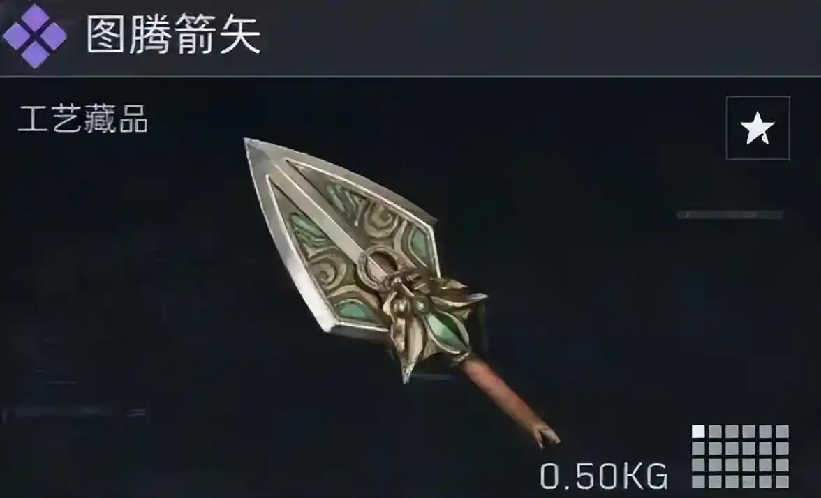图腾箭矢,本次(this time)更新的唯一紫色工艺藏品,1格,价值(value)在1.5万左右(about),主(zhu)要在航天基地和长弓溪谷产出。