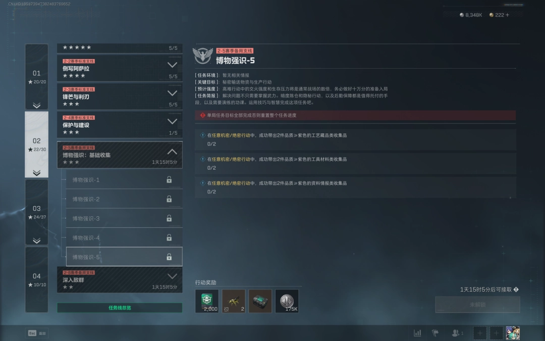 在任意(renyi)机密/绝密行动中,成功带出2件品质(quality)≥紫色的工具(gongju)材(cai)料(liao)类收(shou)集品。