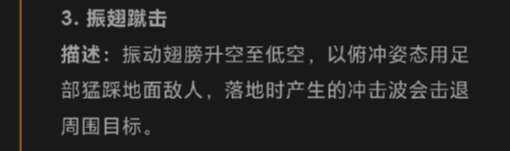 振翅蹴击同样不容小觑,欧布猛斯王振动着巨大的趐嫎腾空而起,升至低空后,以俯冲的姿态迅猛地向地面的敌人扑去,用强有力的足部猛踩敌人,落地瞬间产生的冲击波如同海啸般向四周扩散,将周围的目标全部击退,即使是距离较远的敌人也能感受到那强大的冲击力。