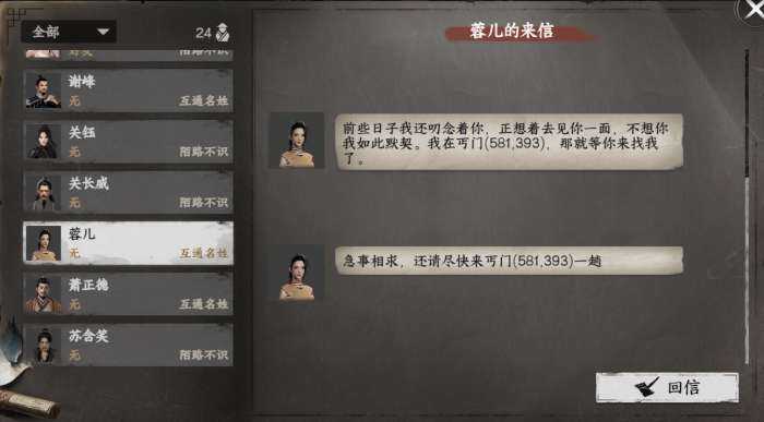 做悬赏任務将门派好感提升到25时收到蓉儿飞鸽
