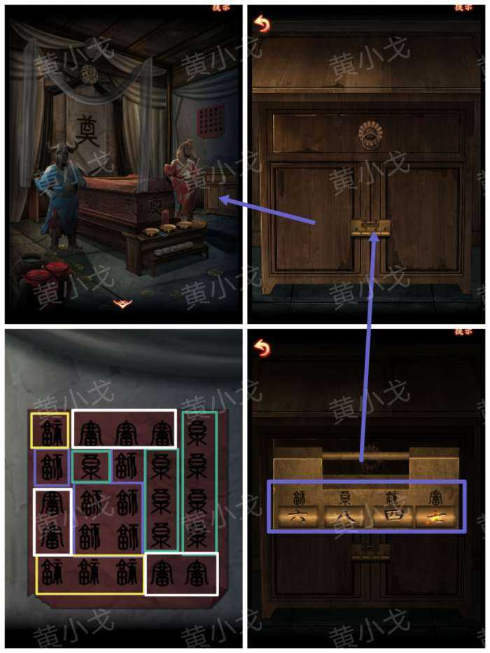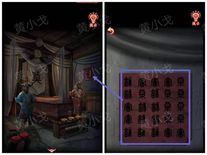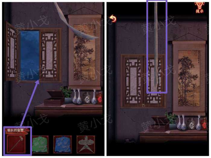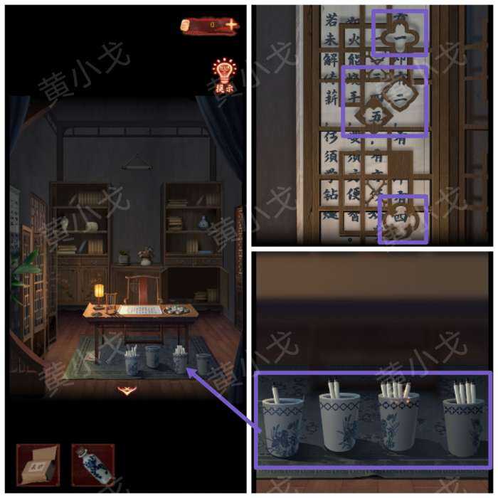7.点击地上的瓷瓶,根据瓷瓶上的图案(an),结合屏风上的形匨及对应画上的字的线索,把卷轴按正確的数量(shuliang)放入瓷瓶中
