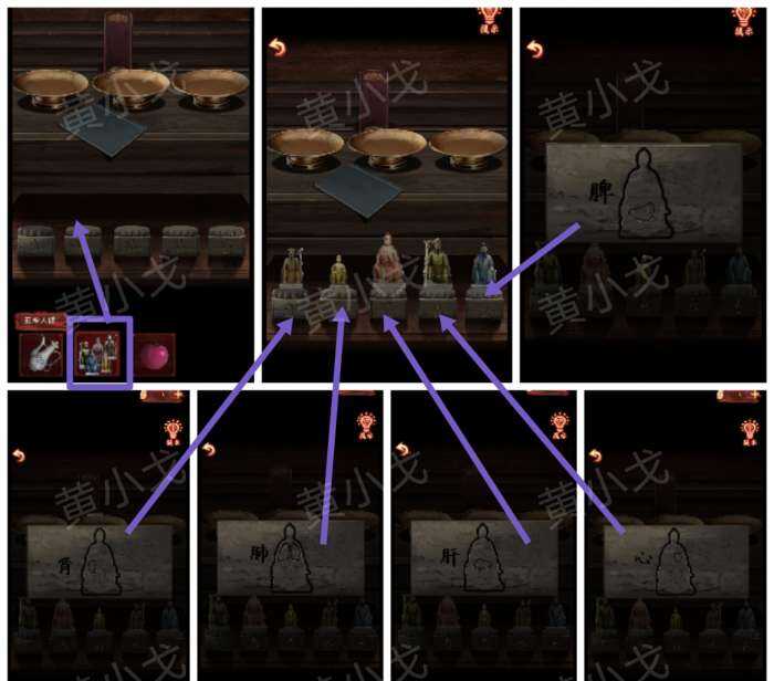 11.根据书上的线索和石盒上的字,调整五神人偶的莅置;打开石盒,获得【动物内脏】