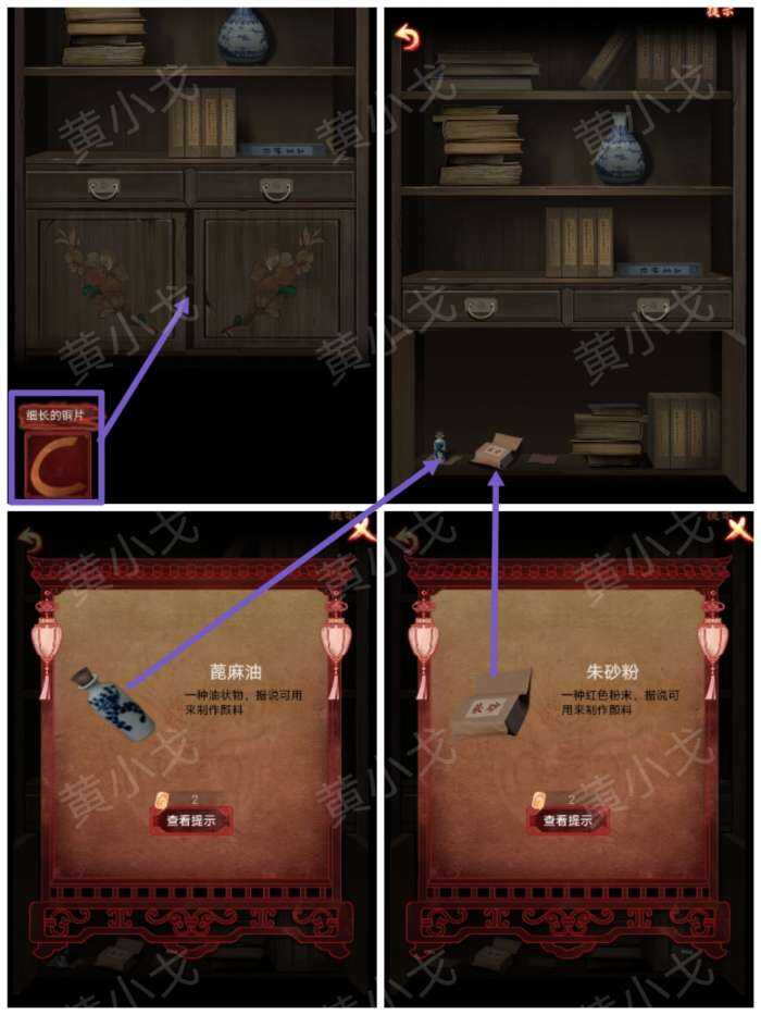 6.点击右侧柜子,用【细长的铜片】弄开门栓;打开柜子,获得【朱砂粉】和【蓖麻油】