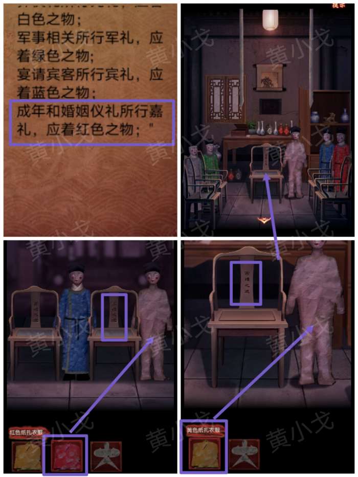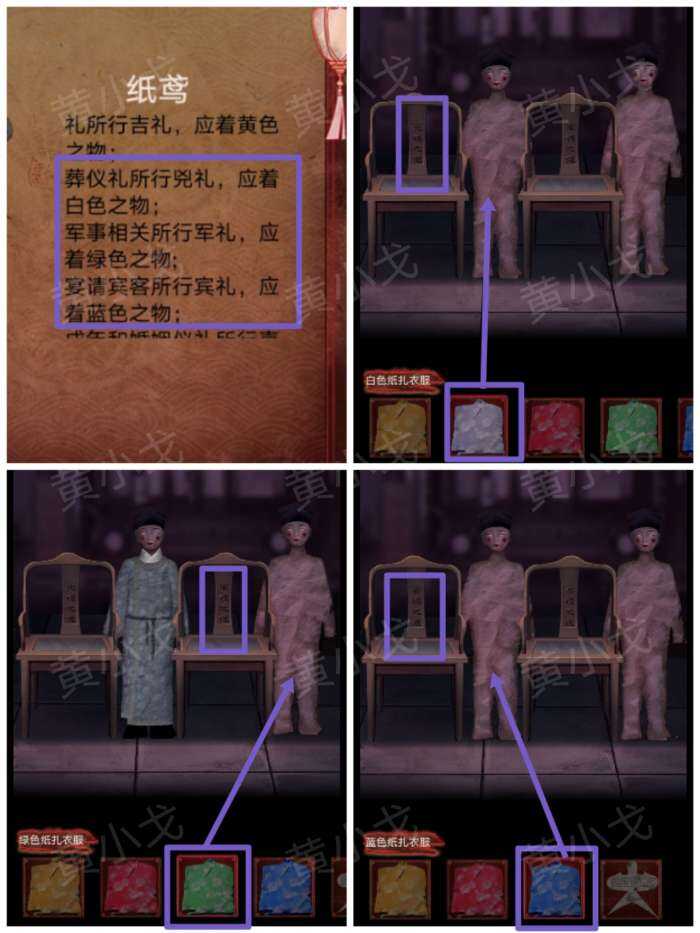 34.根据【纸鸢】上的线索,结合椅子上的字,把对应颜色的纸扎扆棴给纸人穿上
