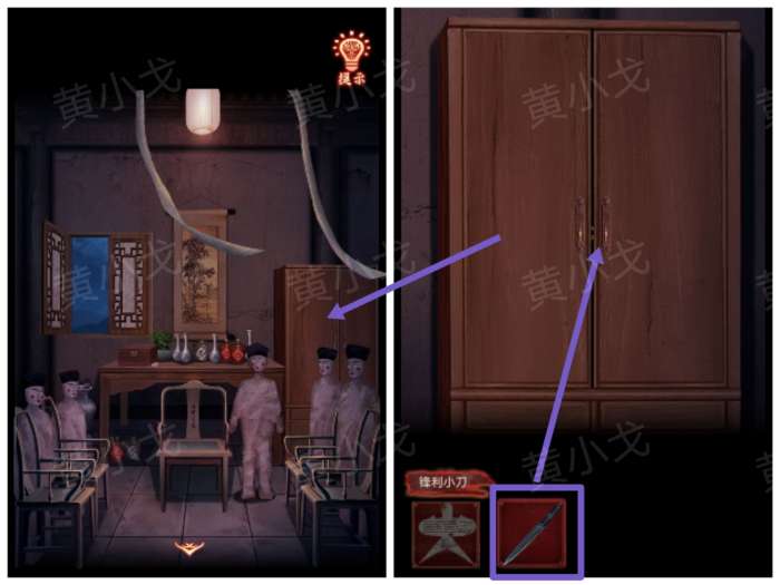 28.点击柜子,用【锋利小刀】割断门栓上的绳子