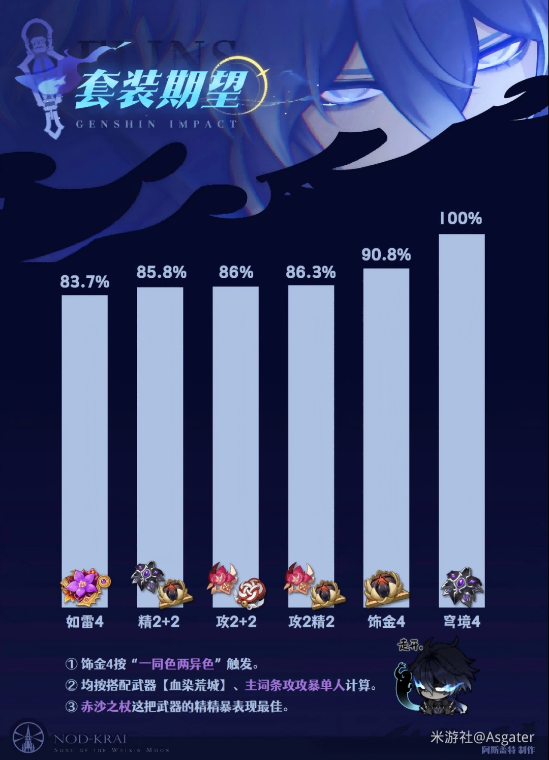 ①【穹境4】是最契合菲林斯的套装——降低圣遗物暴击濡浗、更易满暴。