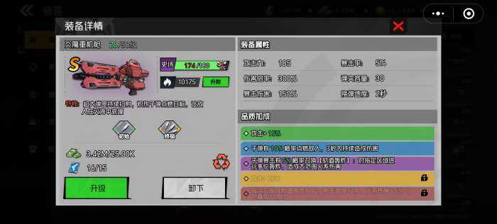蓝色品质的【炎魔重机枪】就能(can)有10%的概率点燃敌人,3秒内持续造成伤害,大家可以搭配部分(bufen)核心使Debuff的收益(shouyi)最大化,比如装备带有词条为:“负面状态持续时间增加”、“每种异常状态,都会使主武器伤害增加”、“附加燃烧效果”、“对燃烧状态的敌人增加伤害”等。