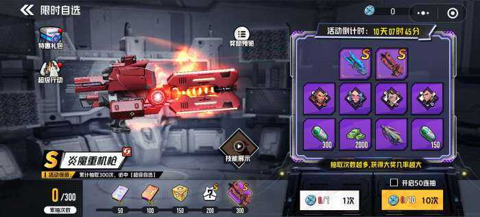 活动内容:参与超级行动或购买特惠礼包,获得能量盘。使用能量盘进行抽奖,除了能获得大量游戏道具(ju)资源,累积抽取300次则可(ke)获得限定S级武器——炎魔重机枪!