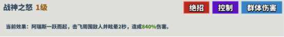 描述:阿瑞斯一跃而起,击飞周围(wei)敌人并眩晕2秒,造成840%伤(shang)害(hai)。