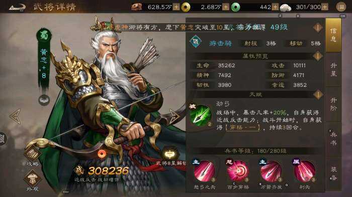但是升阶、兵书也提升了一些暴击还是并不多,但是他的(tade)技能(jineng)和神兵又补足了一些暴击不足的问题,所以如果需要培养的话,比较依赖神兵,可以说有了神兵,黄忠是质的飞跃。