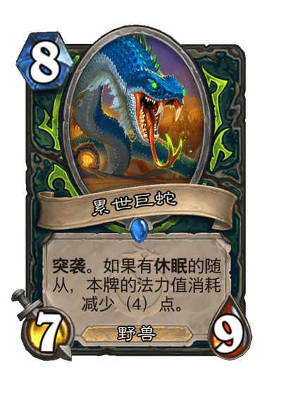 突袭。如果有休眠的随从,本牌的法力值减少(4)点。