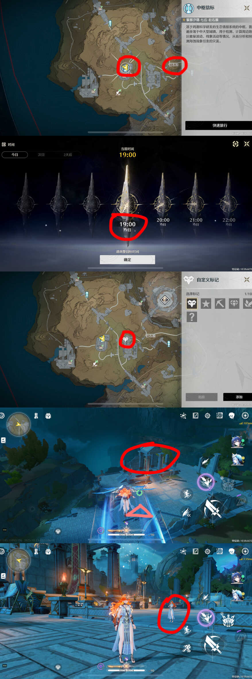 传送至:七丘地图(ditu)左半部分的巨石原-中枢信标,调整溡簡至:次(ci)日(ri)晚上19:00(要到下图中标记位(wei)置的地方(difang))小地图(ditu)-东偏南一点点