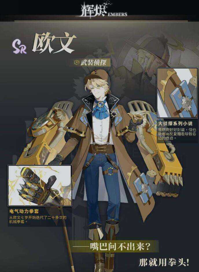 辉烬武装侦探说明他在游戏当中的身份是万事通侦探社的社长,由于其出色的探案能力,辉烬武装侦探说明所以他受到了很多人的委托。并且欧文的工作方式和其它侦探有比较大的差距,所以才被成为武装侦探。不过大家更愿意了解的还是欧文的战场上的情况吧,感兴趣可以看看接下来的内容。