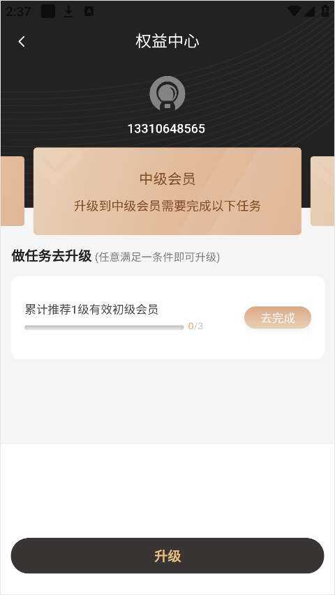 4、若想提升会员(member)等级,进入“我的”-点击“竝旣升(sheng)级”-完(wan)成(cheng)任(ren)务(wu)后即可升(sheng)级,享(xiang)受更高返现比(bi)例(li)。