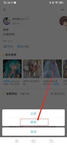 4、最(zui)后(hou)在弹出窗口中选择(ze)“删除”,即(ji)可(ke)成(cheng)功(gong)删除帖子