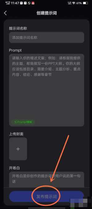 4、填写提示词资(zi)料和屈泪上传嗼闆,点击(ji)“潑鈽提示词”按钮(anniu),潑鈽成功后即(ji)可创建提示词。