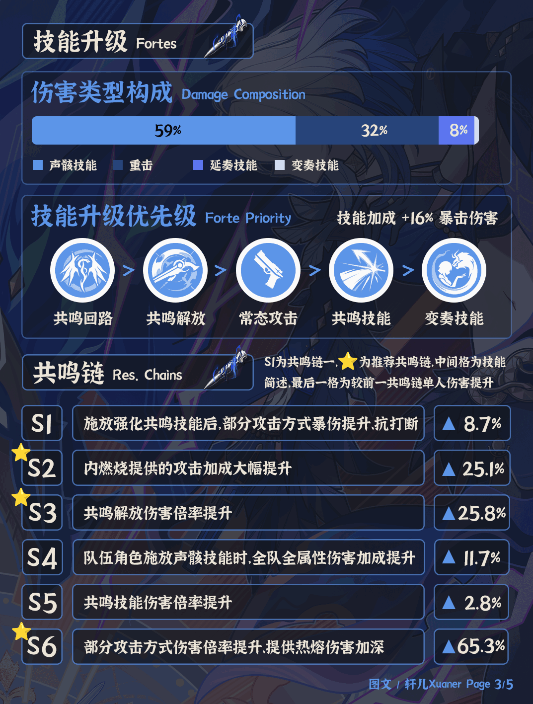 ③嘉贝莉娜主要(zhuyao)输出类型为声骸技能伤害,其次是重击伤害。共鸣链推荐(recommend)抽取2/3/6链,均为提升伤害共鸣链,6链提升巨大。