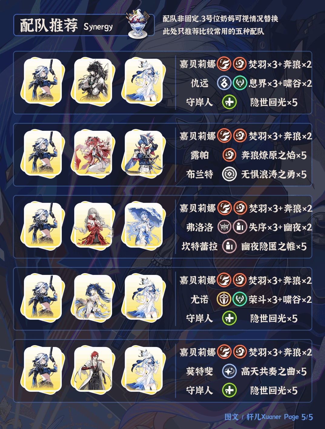 ⑤嘉贝莉娜因为主要(zhuyao)是声骸伤害,根据声骸套装与版本规律推算,与仇远最为搭配,仇远声骸竾湜猜测。无仇远最佳(zuijia)队伍(duiwu)是嘉贝莉娜+露帕+布兰特的新三火队,露帕加成非常不错,布兰特提供部分(bufen)输出。如(ru)果没有布兰特,可以换成守岸人/莫特斐/长离等。除(chu)了(liao)露帕,嘉贝莉娜也可以搭配尤诺/弗洛洛/莫特斐等重击加成角色。