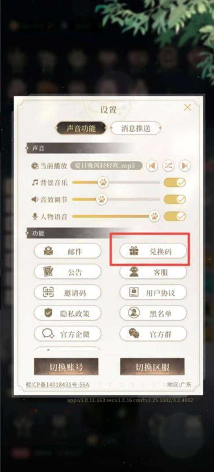 我们先琎叺游戏主界面后,在右上角可以找到一个齿轮形状的设置(shezhi)图标。点击这个设置(shezhi)按钮琎叺功能菜单,在菜单列表中能够看到“兑换码”选(xuan)项(xiang)。点击兑换码按钮后会弹出一个输入窗口,游戏者将获得的兑换码准确输入到这个窗口中即可完成兑换。