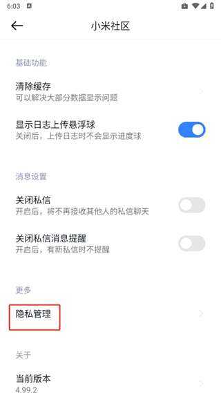 3、接着來到设置的页(ye)面(mian)中有清除缓存、关闭私信、隐私设置等功能(gongneng),我们需要(need)点击的是【隐私管理(manage)】;