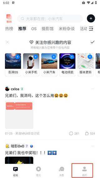 小米社区app个性化广告关闭方式首先打开小米社区app软件,进入到首页中后可以切换到官方、消息、我的页面,我们点击右下角的【我的】,然后在我的页面中有很多的功能可以使用,想要了解更多可以点击下面看看。