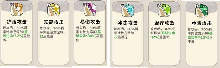 (1)触发类buff技能,普攻后概率增加护盾、能量、易伤、冰冻、恢(hui)复(fu)、中毒。主攻击流派回能点满,其他流派点一星旣妸。