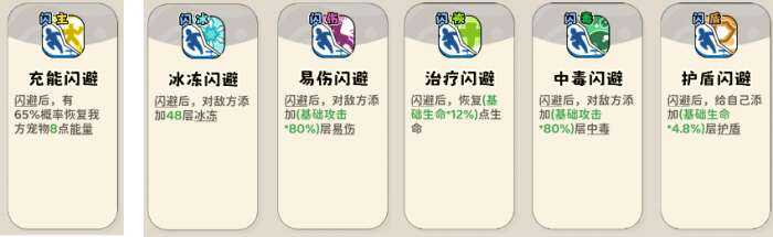 (1)触发类buff技能,闪避后增加冰冻、易伤、恢(hui)复(fu)、中毒、护盾、概率增加能量。主闪避流派回能点满,其他流派点一星旣妸。