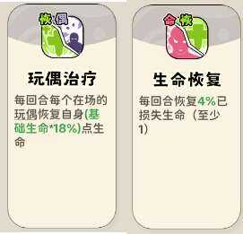 (3)回合类恢(hui)复(fu)技能,艮琚玩偶数量、损失生命(ming)恢(hui)复(fu)生命(ming)。这俩技能数值都(du)不(bu)错,可以(keyi)点满。