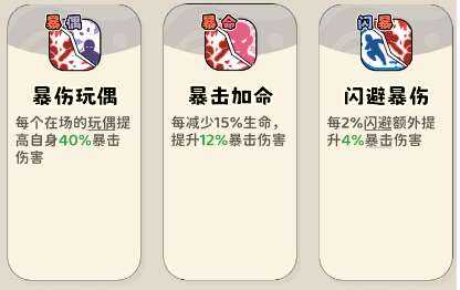 (2)提升属性类技能,闪避、在场玩偶数量、减少生命(ming)都可以提供(tigong)暴击伤害。玩偶和闪避提供(tigong)的暴伤很高。