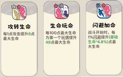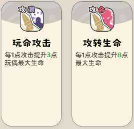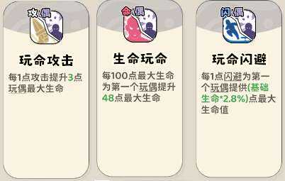 (2)提升属性类技能,每点攻击提升生命(ming)、玩偶生命(ming)。此技能为基础攻击,数值一般,一般不点。可用来补流派点数。