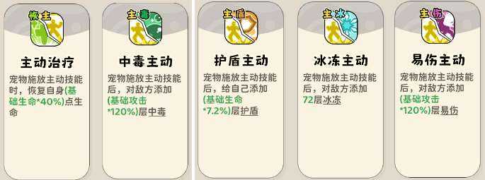 (2)宠物技能触发buff类技能,宠物释放主动技能后添加恢(hui)复(fu)、中毒、护盾、冰冻、易伤。因为主动流宠物技能释放频繁,先点一级后,都可以选择点满。