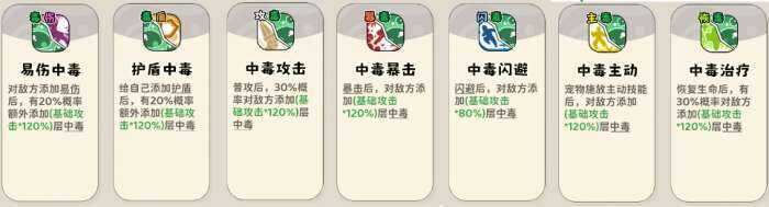 (1)触发类buff技能,普攻、暴击、闪避、添加易伤、添加护盾、恢(hui)复(fu)、宠物释放技能后添加中毒。艮琚主力流派点满对应技能。