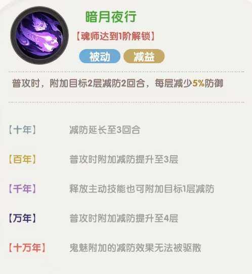 第1个被动暗月夜行,在普攻时可以给目标附加两层减防效果,每层可降低5%的防御。提升魂环年限后,释放主动技能也可以额外附加减防,最多能叠加到4层,且无法被驱散。降低对(dui)方(fang)防御后,当然队伍中的其他角色就能(can)打出更高的伤害(harm)了。